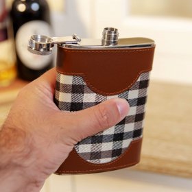 A handsome check fabric and tan leatherette wrapped large stainless steel hip flask and shot glasses gift set.