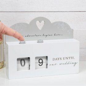 Count down the days to your wedding with this elegant white & silver wooden countdown calendar clock.